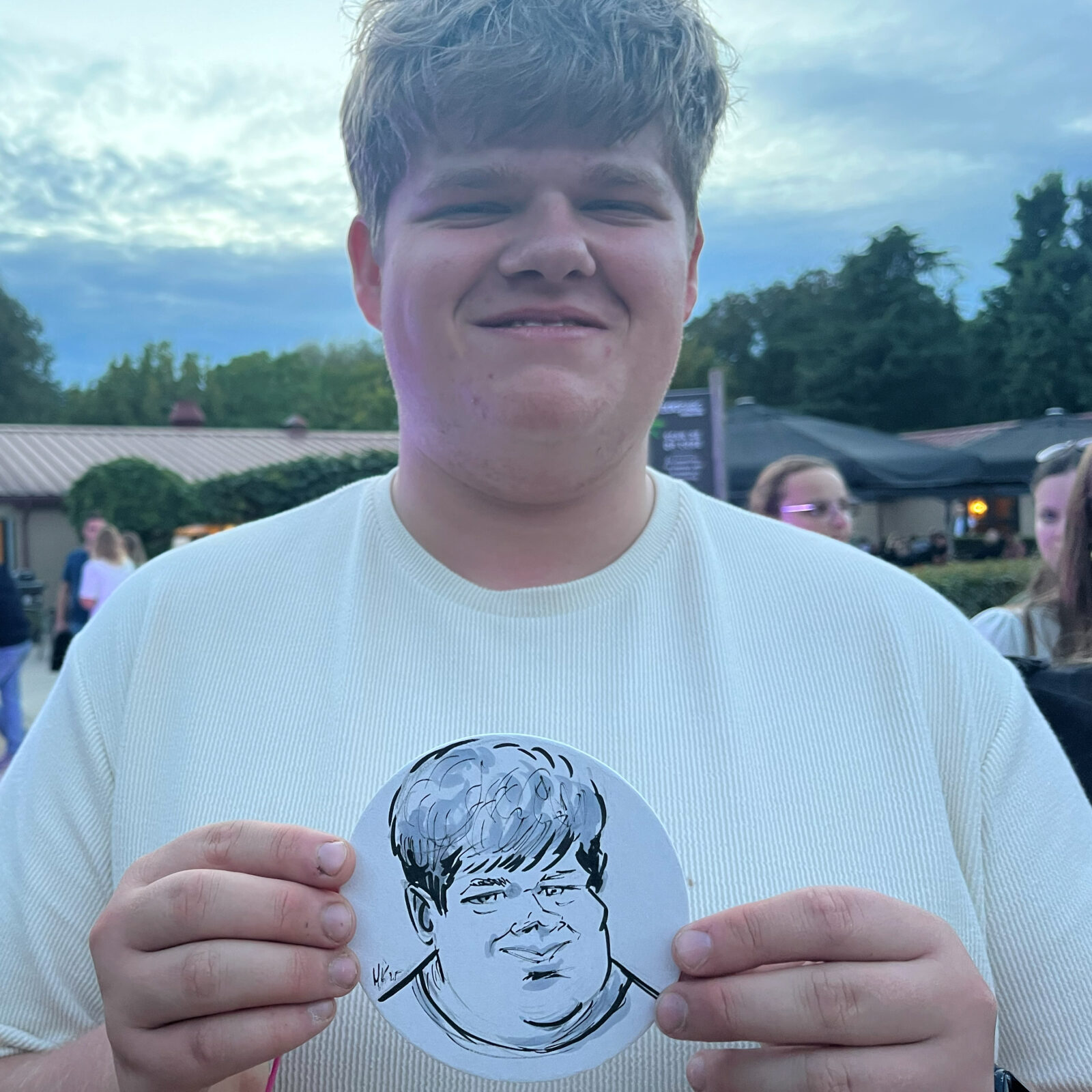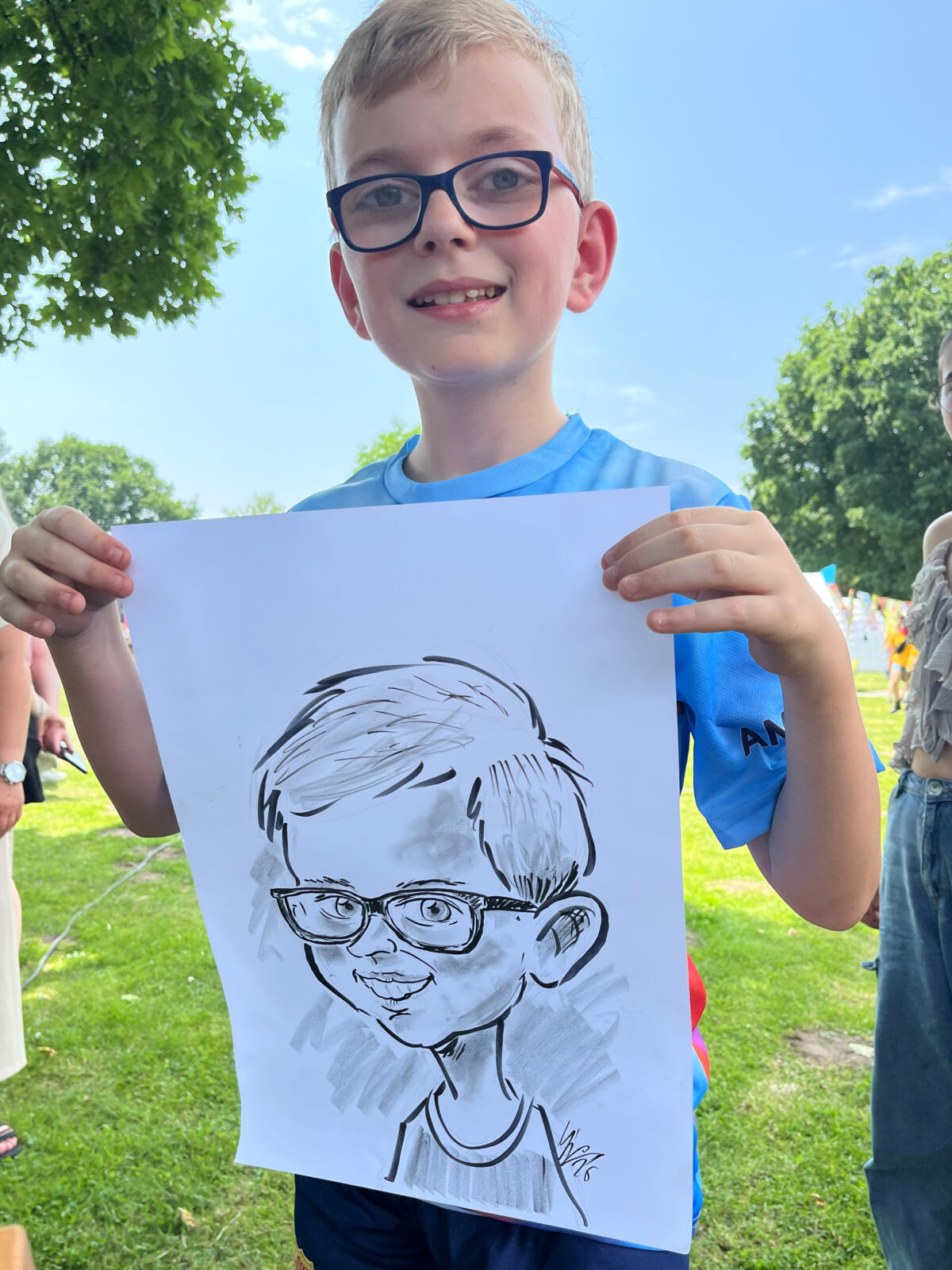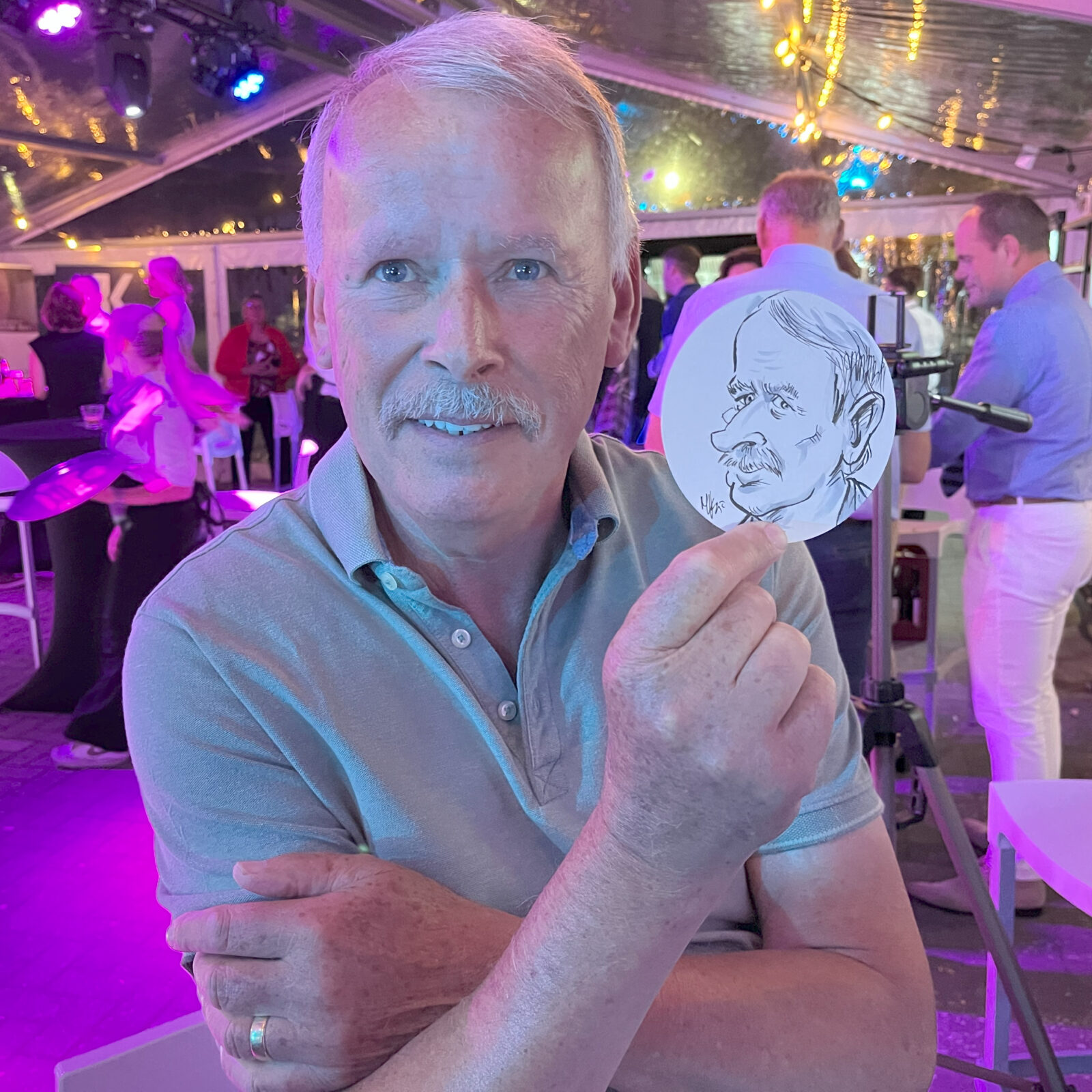 Een karikatuur live op locatie. Binnen 10 minuten worden de aanwezigen vastgelegd, “snel” maar een goede gelijkenis van de geportretteerde is een belangrijke voorwaarde.